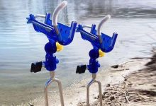 This is a blue fishing stand. At the bottom are two metal long legs that can be inserted into the ground to provide stable support. There are blue adjustment components, yellow knobs, and black adjustment bolts in the middle of the bracket, which facilitate adjusting the angle and height to meet the needs of different fishing scenarios. The U-shaped bracket at the top is used to hold the fishing rod, and there is also a white auxiliary hook next to it, which can hang small objects such as fishing line. The overall design is compact and practical, freeing up both hands and making it easier for anglers to wait for fish to bite. It is a commonly used auxiliary tool for fishing enthusiasts when fishing outdoors by the shore or lake.